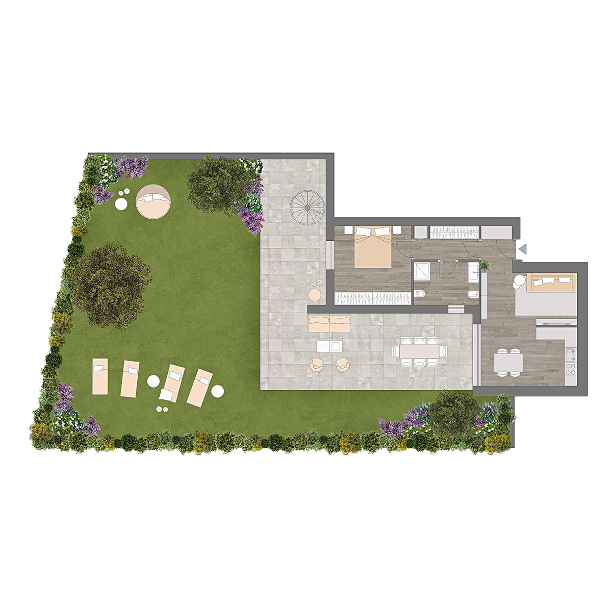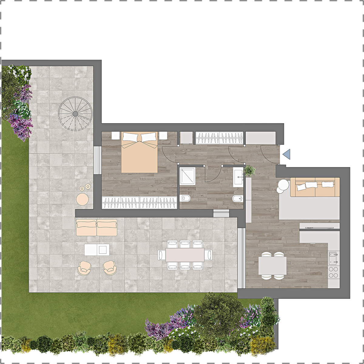 The entrance leads to the bright open-space living area with an open kitchen. From the hallway, gives direct access the sleeping area, consisting of a master bedroom, and the bathroom completely equipped. All rooms overlook the garden, providing an exclusive connection between indoor and outdoor spaces, an ideal space to spend the warm season in contact with nature. A private external staircase allows access to the sundeck area, a real rooftop garden. The private pool, shaded pergola, and set-up for an outdoor kitchen, are elements that defines its uniqueness and sophistication: an exclusive space to live in total comfort and privacy with a charming view of Lake Garda.